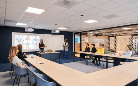 Inmiddels is online en hybride lesgeven verankerd in het onderwijs. Wat wij nu zien, is dat opleiders een ruimte met hybride set boeken om meer studenten te kunnen laten deelnemen. Je zit tenslotte niet meer vast aan de zaalcapaciteit!