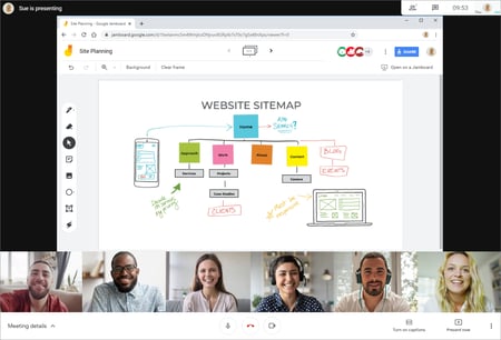 Met Google Jamboard maak je leren visueel en toegankelijk voor iedereen. Deze additionele tool zet jouw hybride bijeenkomst kracht bij: Deel je pitch, groepswerk of brainstorm ideeën direct in realtime via Meet of nodig mensen uit en werk samen aan één Jam. Het creatieve denkproces wordt direct in kaart gebracht. Op deze manier vergeet je niets en kun je bouwen op elkaars creativiteit.