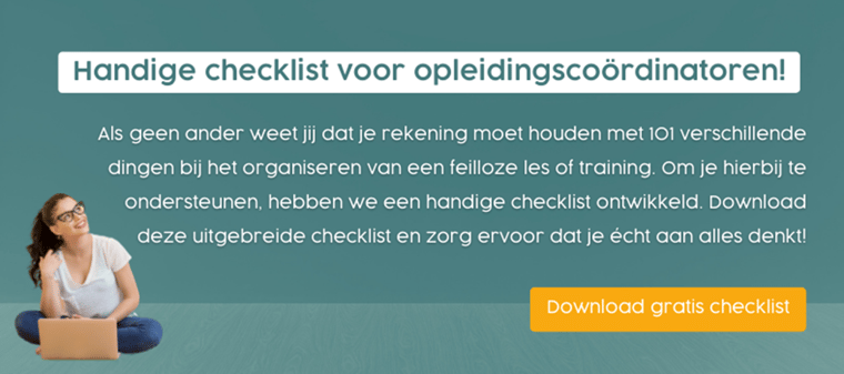 Omdat het nu eenmaal niet vanzelfsprekend is om keer op keer een feilloze les of training te organiseren, hebben we een handige checklist voor je ontwikkeld. Download deze uitgebreide checklist en zorg ervoor dat je écht aan alles denkt.